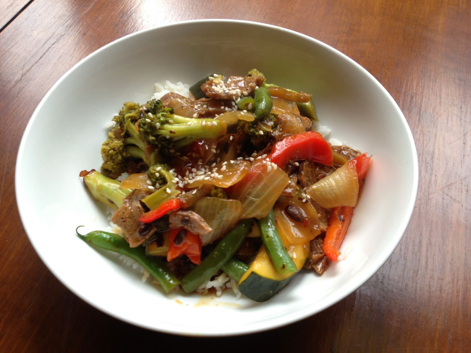 This meal has been on fairly high rotation the last few months. Blue Dragon have a vegan black bean sauce that seems to constantly be on special for $2 at Coles and I've discovered these veg beef strips at my local KFL supermarket, $2.55. Grab some fresh veggies on the way home from work, re-hydrate the strips for 30 minutes (squeeze out water once softened) and get the brown rice cooking - weeknight win.